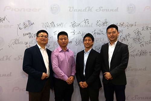 從左至右:美國杜比實驗室國際技術服務(上海)有限公司亞太區高級市場總監郭昌宏先生、深圳瑟爾科技有限公司總經理胡特先生、日本Pioneer家用產品市販部部長奧田秀希先生、美國杜比實驗室大中華區市場總監柯永德先生