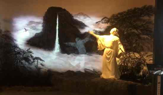 在“浣紗得鯉”的場館中,通過CU4200WD 天花板隱藏安裝進行融合投影,將日升日落,朝陽晚霞呈現的層次分明、淋漓盡致,生動再現了當時“浣紗得鯉”婦人洗衣的生活場景。李白的生平場景被投影機用這樣的方式演繹出來,讓游客仿佛置身其中,感受到一個更加鮮活的李白形象。