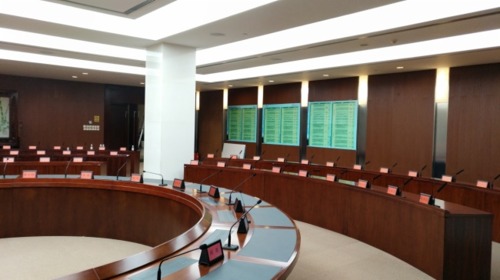 成都市政府101會議室是進行每周常務會議及工作會議的重要場所,使用頻率高,會議室以圓桌加扇形桌擺放形式,坐席為103個,均需要鵝頸會議話筒,且需要103支話筒全開,發言完畢才會關閉話筒,原系統使用音柱揚聲器兩只,聲場均勻度差,語言清晰度差,且容易產生嘯叫,不能滿足客戶使用需求。