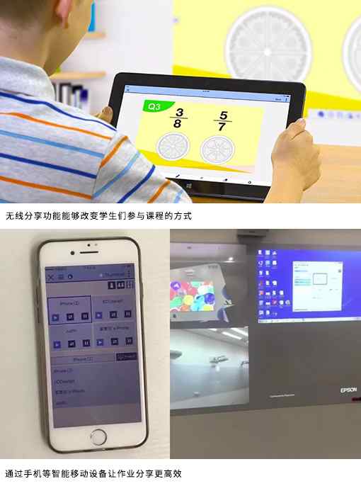 或許,是否有一種方法,幫助教師離開講臺的束縛?答案是:Yes!只要活用愛普生互動教學(xué)投影機(jī)的無線分享功能,隨身攜帶的移動智能設(shè)備(手機(jī)、iPad等)或者筆記本電腦可變身為靈活的教學(xué)工具,可在教室內(nèi)任意位置,實(shí)現(xiàn)與投影機(jī)的人機(jī)交互,為他們帶來全新的課堂體驗(yàn)。