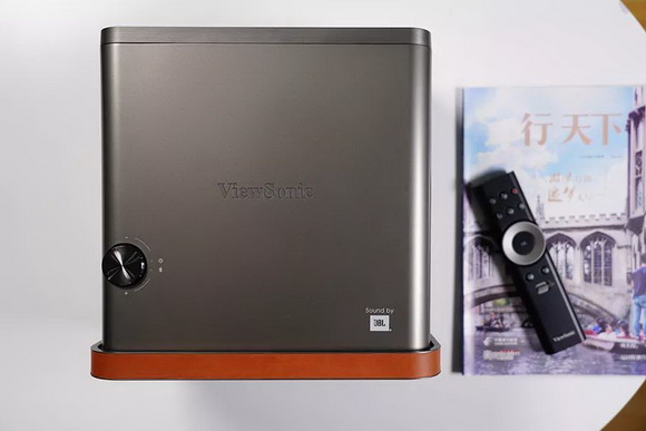 簡潔的頂部只有正中間“ViewSonic”的英文logo以及右下角JBL的logo,顯而易見,優派X10-4K的高品質音箱來自JBL。而左下角偏上一點是一枚可以旋轉的帶著同心圓紋理實體按鈕,這顆按鈕起著電源鍵和音量鍵的作用,同時邊上還有兩顆指示燈,顯示著投影儀和藍牙音箱兩種工作模式。