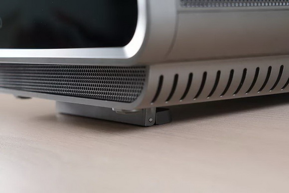 正面被一塊靜謐的黑色蓋板所覆蓋,中間的是投影鏡頭,整個投影系統的核心所在。右側有一顆自動對焦攝像頭和一顆紅外傳感器。左下角依次是優派的logo、4K UHD的標志和LED光源的標志。正面底部被金屬的蜂窩孔覆蓋,中間隱約能看見超聲波智能傳感器。當有物體靠近燈源時,便會自動關閉,避免人的眼睛受到傷害。
