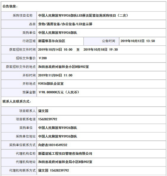中國人民解放軍93926部隊LED屏及配套設施采購項目(二次)公開招標公告