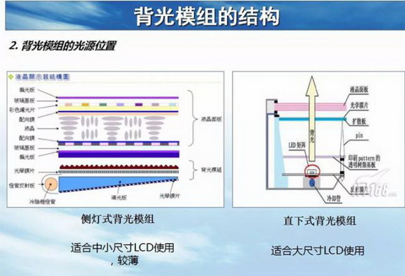 背光源是提供LCD面板的光源。主要由光源、導光板、光學用膜片、塑膠框等組成。背光源具有亮度高,壽命長、發光均勻等特點。目前主要有EL、 CCFL及LED三種背光源類型,依光源分布位置不同則分為側光式和直下式(底背光式)。隨著LCD模組不斷向更亮、更輕、更薄方向發展,側光式CCFL式背光源成為背光源發展的主流。