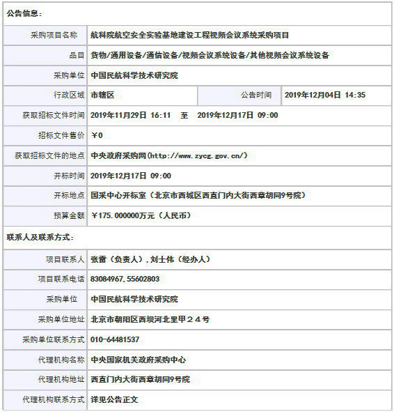 采購項目名稱: 航科院航空安全實驗基地建設工程視頻會議系統采購項目