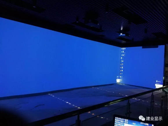 根據現場實地測量的安裝環境數據,展示廳的尺寸畫面分為前面12米×3.8米,側面4米×3.8米,地面12米×6米 墻面用五臺5臺VIVITEK的RU70953,分別是正面三臺,左右各一臺,地面采用12臺RW46513 使用2×6的排列方式。