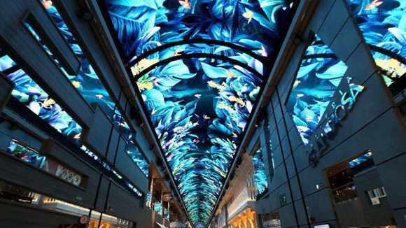 船上的室內(nèi)長廊是整艘游輪的社交中心,也是該項(xiàng)目上最大的亮點(diǎn)所在——為這艘游輪專門定制的93米長三星曲面LED IF040H-D顯示屏就安裝在此長廊的天花板上。這款顯示屏的設(shè)計(jì)充滿動感,幾乎時時刻刻都在營造著一種令人驚嘆的氛圍。也正是這塊顯示屏,每天都會為游客呈現(xiàn)三場令人心醉神迷的視覺表演盛宴。