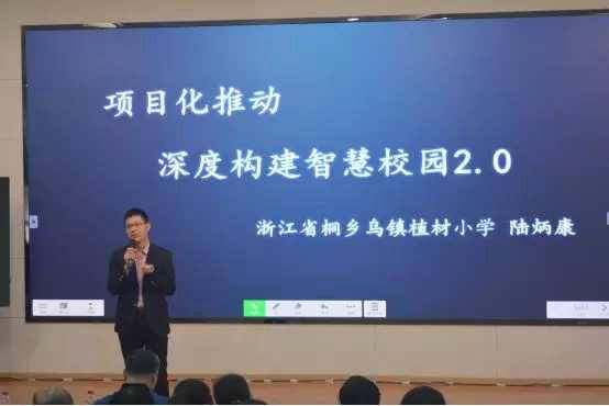 隨后,針對智慧校園建設和應用,浙江省桐鄉市烏鎮植材小學陸炳康副校長分享了《項目化推動,深度構建智慧校園》主題報告,為區域未來學校共同體成員學校、區數字校園及智慧學校試點學校提供了可借鑒的案例。