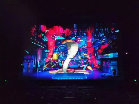 同樣是在光影奇境體驗區的“4D夢工廠”動感特效影廳,采用2臺PH3501QL工程機打造了23米巨幅弧幕,跟隨4D動感座椅的晃動,領先的4K級3D技術,能夠欣賞到呼之欲出的立體影像。搭載的頂級DCI影院色彩,更能完美真實地呈現電影中所要呈現的所有色彩。