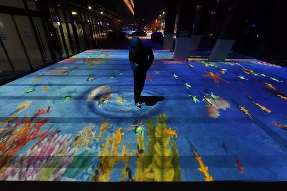 各種奇幻的影像在腳下綻放,魚兒隨著觀眾的腳步四處游竄,在虛擬的水面上泛起陣陣漣漪,讓人忍不住想參與到畫面中來。