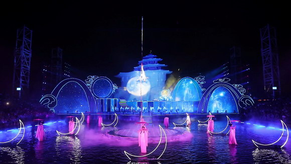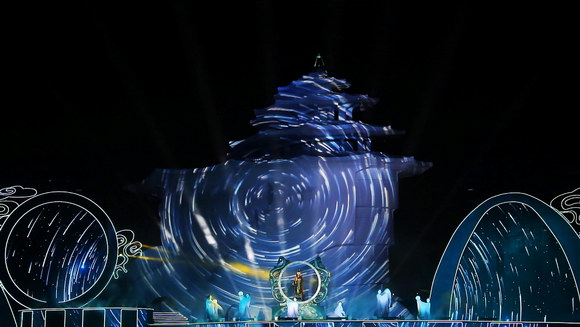 彼時,碧螺姑娘從畫面中躍然而出,燈光聚焦處,宛若仙子在水中央緩緩而立,衣袂飄飄,立體投影畫面與真人表演情節(jié)極度吻合。夜幕下,渤海邊的碧螺塔與3D Mapping投影影像渾然天成,令現(xiàn)場觀眾不禁紛紛鼓掌,歡呼與掌聲在海邊上空經(jīng)久不息。