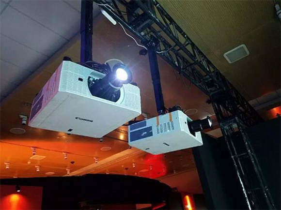 本次展會佳能同時展示了無線投影解決方案,該方案使用了一臺佳能超短焦投影機WUX500ST,機身搭載了一支投影比為0.56:1的超短焦鏡頭,可支持最大75%的垂直鏡頭位移。