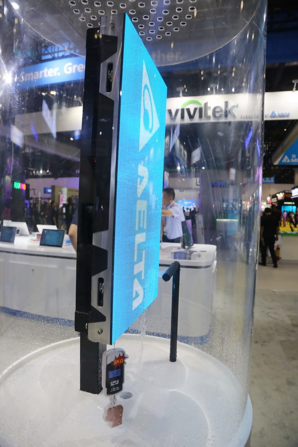 此處展出的臺(tái)達(dá)P1.2mm小間距LED,也特別呈現(xiàn)其防潮防水、堅(jiān)固耐沖擊的特質(zhì)。臺(tái)達(dá)小間距LED通過真空納米涂層技術(shù),具有更加優(yōu)秀的防潮、防水、防鹽霧性能表現(xiàn),兼具能耗低、使用壽命長(zhǎng)及出色的亮度、色彩等特點(diǎn),是環(huán)境相對(duì)較惡劣的控制室、商業(yè)顯示等室內(nèi)高端顯示的最佳選擇。