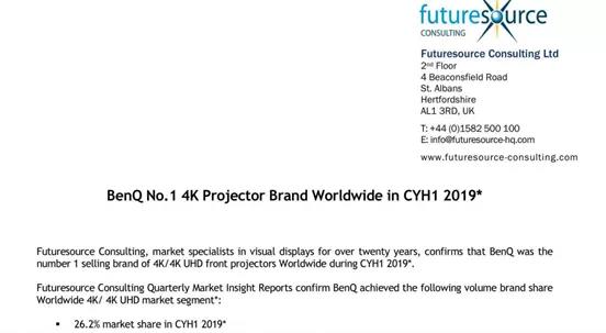 不僅如此,明基4K投影機于2019上半年全球市占登頂(根據FutureSource 報告),成為走進消費者內心的高階投影品牌。