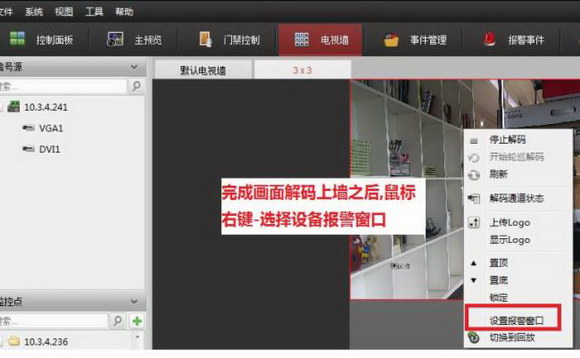 解碼上墻成功后,選中需顯示報警畫面的窗口鼠標右鍵,點擊“設置報警窗口 ”。即可將該窗口設置為報警窗口。
