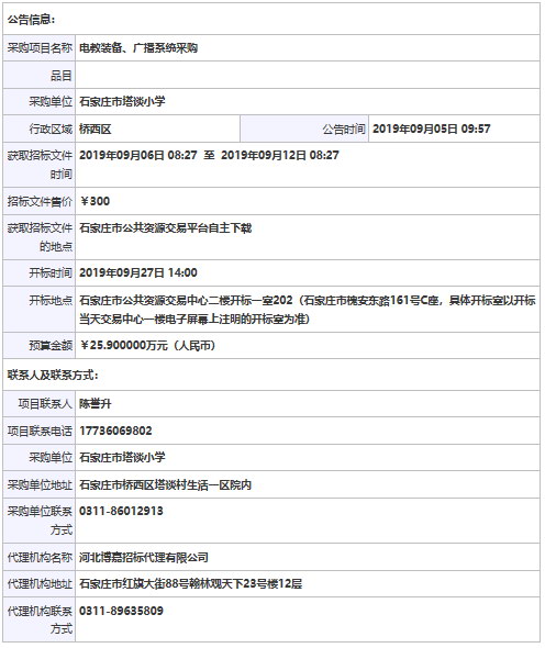 石家莊市塔談小學電教裝備及廣播系統采購項目招標公告