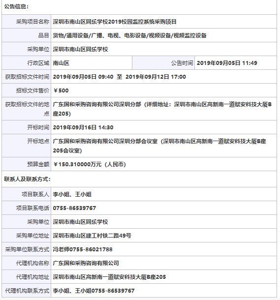 > 深圳市南山區同樂學校2019校園監控系統采購項目招標公告