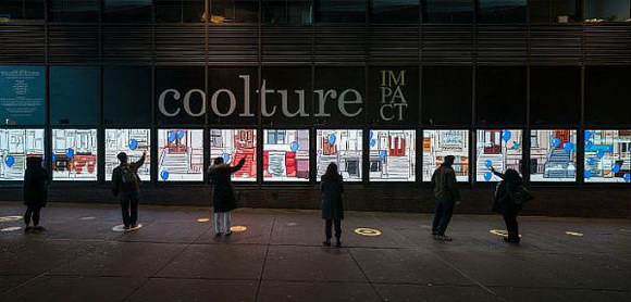 紐約港務局巴士總站的櫥窗日前已被改造成COOLTURE IMPACT,這是一種采用運動響應技術設計的互動裝置。運動傳感器攝像機跟蹤系統可捕獲路人的手勢和動作。NoirFlux設計了交互式框架軟件系統,Stereolabs提供了ZED 3D深度和運動感應攝像頭,利亞德提供了TVH系列小間距LED視頻墻。