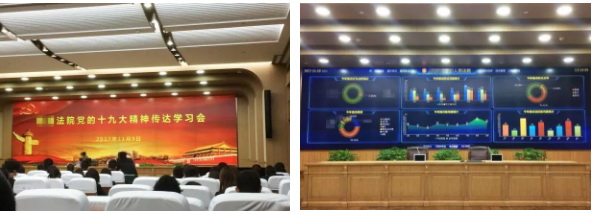 上海市閔行區人民法院采用MICS云系統進行綜合管理,可對訴訟服務、案件審判、案件執行、審判管理、警務指揮、司法公開、綜合行政與隊伍管理等各司法執行環節進行綜合可視化統一管控。同某法院相比,閔行區人民法院管理系統更可將轄區內各鎮庭審信息統一匯聚展現,多種庭審信號畫面進行調度上屏,同時也支持多類第三方軟件與平臺,將矩陣及視頻會議融合對接,達到同步高效的日常庭審管理。