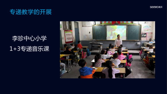 朱主任接著分享:“起初,我們擔心山區網速無法支持實現這一想法,但是希沃產品最低只要求上行4M即可使用,這很好地保證了專遞課堂穩定傳輸,做到不延遲。我區通過課表排課的功能,將教學點開不齊的音樂、美術、英語課與中心小學排在同一時間。在中心小學老師授課時,教學點教室里只要打開希沃錄播主機連接互動,就可以和中心小學同上一節課。一個中心小學的老師既可以帶著本教室的學生,也可以同時帶著幾個教學點的學生同步上課,完全沒有影響中心小學的正常上課節奏。通過這種互動上課的形式,在課堂上中心校師生與教學點學生互動交流,不僅讓教學點開齊了課,也讓在遠程課堂兩端的學生成了同學,交起了朋友。”