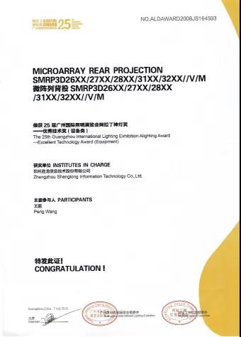 繼今年4月勝龍股份成功入圍2020阿拉丁神燈獎—優秀技術獎后,近日組委會為勝龍股份正式頒發了獲獎證書。