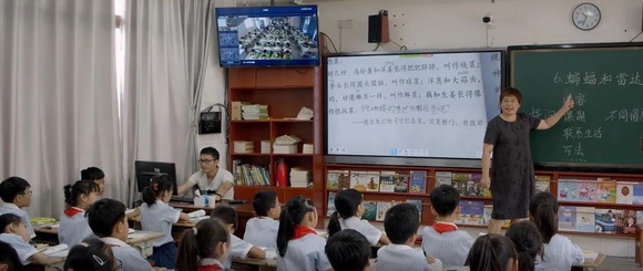 一位學生站在大屏前正在與“未知小伙伴”PK,她的競爭對手是誰?原來,她在和置身幾十公里外楂林小學的同年級小伙伴課堂在線比賽。兩校結成了“互聯網+義務教育”小隊,常態化開展同步課堂。兩校孩子既競爭又合作,上課更活躍了。兩校教師同步評講磨課,得以優勢互補。