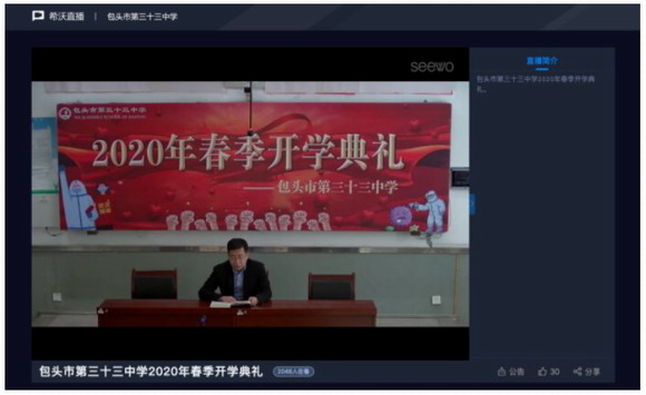 2020年2月16日上午10時,內蒙古包頭市第三十三中學迎來了一個“特別”的開學典禮。今天的開學典禮現場沒有鮮花,也沒有掌聲。散落在家的一個個師生,通過希沃的常態化錄播平臺同步線上直播,三十三中的2千多名師生們參加,凝聚在了一起。但不變的是校長的殷切期望,老師們的孜孜不倦的教導和同學們即將和往常一樣學習到的新知。
