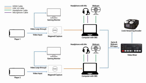 在此次活動制作中,Vision Media使用了8個美樂威USB Capture HDMI Plus采集棒。他們利用常規的轉換器一端連接手機雷電口或USB接口,一端連接美樂威采集棒,就能通過采集棒的HDMI接口采集參賽選手的蘋果或安卓手機直接輸出的游戲視頻。采集棒的另一端則通過標準USB 3.0接口連接電腦,將高質量的視頻傳輸至電腦OBS軟件中。美樂威采集棒還帶有HDMI 環出接口,這讓工作人員能同時在全尺寸游戲顯示器上預覽游戲視頻畫面。