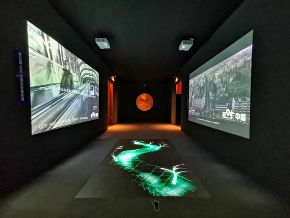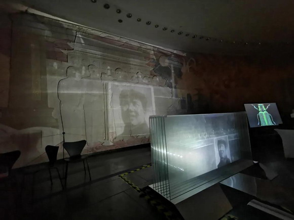 影像透過多層玻璃投射到雕刻壁畫之上,多層玻璃折射讓影像產生“水波紋”視覺效果,“流動”的影像與聲音交織在一起,讓現代科技與傳統壁畫雕刻藝術一起奏響時代的韻律。