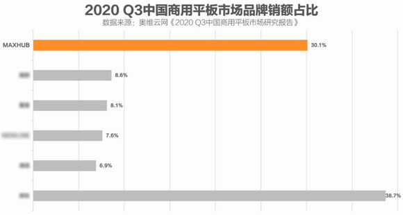 近日,2020 Q3中國商用平板市場研究報告正式發布,報告指出,由于2020年三季度國內整體經濟復蘇加速,國內商用平板市場依舊保持較高的增長態勢,三季度銷售量約11.1萬臺,銷售額約17.6億元。其中,MAXHUB 以25%的銷量占比、30.1%的銷售額占比穩居第一。銷量、銷額市場份額均超出第二、三名品牌總和。截止目前,MAXHUB已在2017、2018、2019年連續三年斬獲國內會議平板市場占有率桂冠【1】。