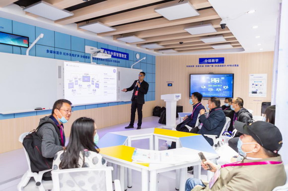 一間等比例還原的智慧教室吸引了現場眾多觀眾進行體驗,東方中原智慧教室是通過與眾多教育信息化專家及大量一線教育工作者深入交流,結合自身在教育教學場景中對需求的精準挖掘,從智慧教育教學、智慧環境控制、智慧運維管理三個方面打造的新型標桿性智慧教室。它具有多媒體顯示系統、紅外無線擴聲系統、分組教學系統、物聯感知集控系統、信息發布系統及智慧運維系統集一體的整套智慧教室解決方案,可實現高等教育“以學生為中心”的教學需求,有助于師生進行深度交流互動。