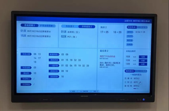 取代了原先傳統的白板,海康威視智護屏對護士站多個系統的醫護數據進行統一采集,致力打造數智化護理。例如,智護屏會根據系統自動幫護士篩選出重要的護理事項,做到重點事件提醒,當天日程還會即時更新,避免誤操作或漏操作的情況出現。此外,護士交班也可以通過海康威視智護屏的交班界面快速完成,交班信息一目了然,效率大大提升,將護士的時間真正還給患者。