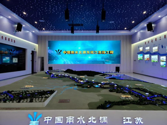 南水北調展示中心坐落于江都水利樞紐核心工程區內,全面展示了江蘇南水北調工程概況。歷經60多年建設和運行,如今江蘇的南水北調工程體系已成為世界上最大的網絡化泵站集群。展廳“南水北調工程功在當代利在千秋”的標語下,剖面圖展示了從0.7米高程的江都水利樞紐,經過9級臺階提升30米,送水逾400公里進入山東的“足跡”。