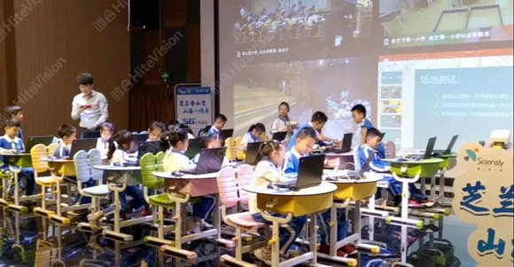 活動現場,雙方通力協作,利用5G技術,在由鴻合智能交互設備、互動錄播主機、4K高清攝像機、全向拾音麥克、互動顯示屏等硬件設備,搭配鴻合互動錄播課堂系統組成的鴻合專遞課堂中,將深圳市南山區香山里小學的優質資源帶到了西藏林芝市第一小學的課堂中,流暢的音視頻互動,以及實時多場景呈現,讓林芝市第一小學學子們異地同步接受到更好的教學資源。