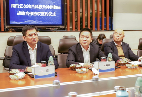 鴻合科技商用業務集團總裁李建宏(下圖左1)、騰訊云副總裁付曼青(下圖中間)、神州數碼集團常務副總裁葉海強(下圖右1)進行三方簽約。