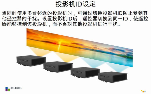 (1)Beverly系列:遙控器SET鍵長按3秒,指示燈亮,然后按對應的數字鍵,比如02,投影機OSD菜單“投影機ID”選項也選擇到對應的ID,最多支持99組ID設定;若要急性ID設定復位,遙控器SET鍵長按3秒,指示燈亮,然后按00即可。