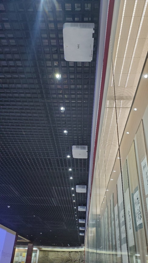 巨幕對面陳列著靜態櫥窗,將動態詩詞與靜態書畫構成一個整體。為了能夠觀看清楚每部作品的細節,展廳天花板設有數量較多的筒燈。考慮到館內強光將影響投影效果的這一因素,哈勃PA1004UL-W+ 液晶激光投影機1萬流明的高亮度,對明亮度和超寬屏畫面效果來說是一個更好的選擇。