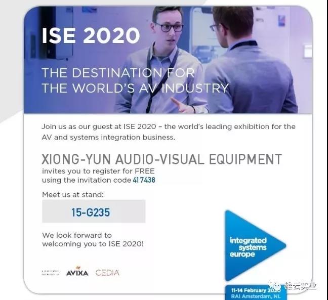 雄云實業攜旗下廣州市雄云視聽設備有限公司和廣州市雄瑞投影幕制造有限公司參加荷蘭阿姆斯特丹視聽及系統集成展會(ISE)。雄云實業將攜創新產品隆重亮相,為全球客戶帶來眾多高端的影音視聽器材產品!