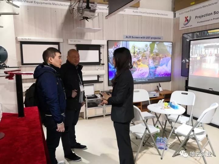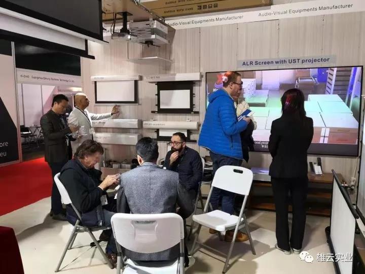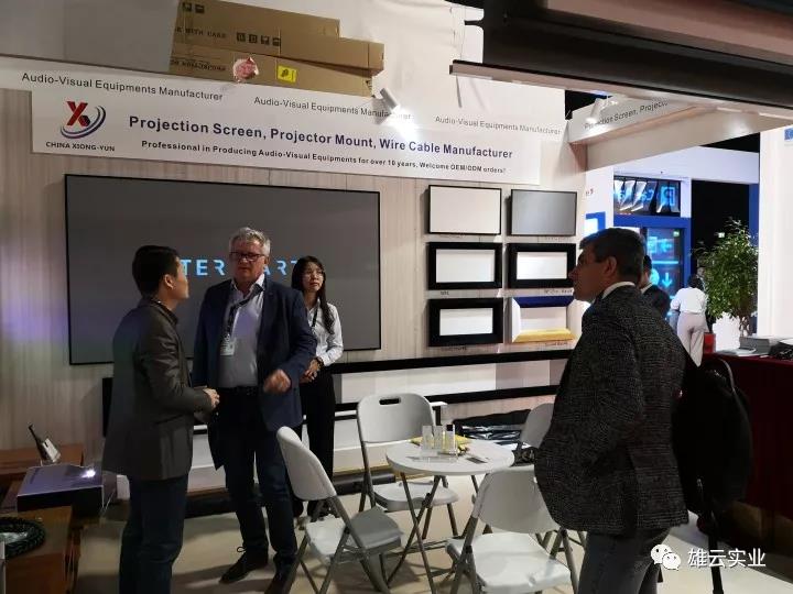 我們的展位呈現了客廳影院系統,家庭影院系統,會議視訊系統等多套系統。眾多高端產品:窄邊黑晶抗光幕、黑柵抗光硬屏、電動幕、豪華電動地升幕、隱藏天花幕等銀幕,還有高端系列吊架和高品質音視頻線材參展,吸引很多國外參展客商的眼球。