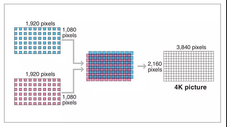 *3 4K增強技術使像素點沿對角線方向位移0.5個像素,分辨率翻倍達到3840×2160, 清晰度超越了全高清的圖像質量。物理分辨率仍為1920×1200。