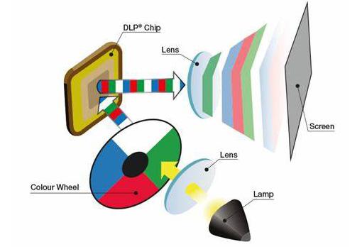 技術原理上看,3LCD機型是把強光通過分光鏡形成RGB三束光,分別透射過RGB三色液晶板,信號源經過AD轉換連通至液晶板,通過控制液晶單元的開啟與閉合,從而控制光路的通斷,RGB光最后在棱鏡中匯聚,通過鏡頭,形成彩色圖像。再來看DLP技術原理,DLP機型將強光通過快速轉動的RGB色輪,投射到數字微鏡裝置DMD,DMD芯片包含成千上萬的微鏡,每個代表一像素,微鏡進行每秒數千次的轉動,通過反射光線來產生圖像。從原理上看,3LCD技術的色彩更加真實穩定,并且杜絕彩虹效應等問題。