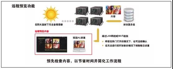 配合增加了NFC功能的Smart Projector Control app 2.0版本,,可以在待機狀態(tài)下設置讀寫并通過智能手機的相機進行自動聚焦。視頻顯示設備監(jiān)控軟件可通過Wi-FI或局域網(wǎng)連接筆記本電腦進行遠程預覽和檢查,也可通過網(wǎng)絡瀏覽器訪問。可在投影機待機、快門開啟以及當陽光直射屏幕時使用。它可在安裝完成前提供修復錯誤的機會。