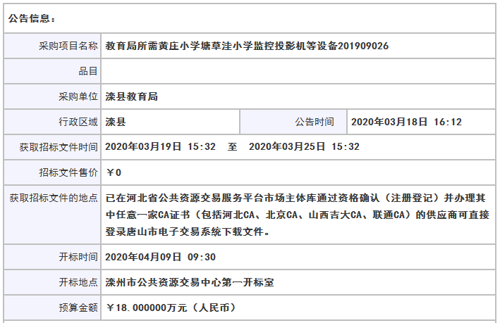 灤州市教育局所需黃莊小學塘草洼小學監控投影機等設備201909026招標公告