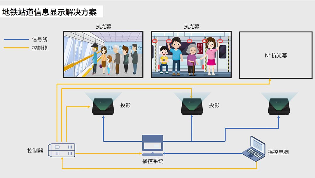 系統(tǒng)設計需求:屏蔽門畫面顯示不影響乘客正常上下車,人流密集區(qū)降低安裝風險;在高風壓的密閉地鐵軌道空間,投影機必須擁有高穩(wěn)定性能,適應多灰塵運行環(huán)境;多屏幕集中控制。投影顯示亮度需求:6000-13000流明分辨率:≥1920*1080