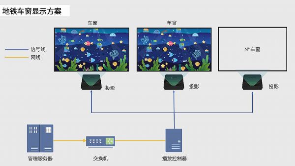 系統(tǒng)設計需求:在不改變車窗結(jié)構的情況下,清晰顯示智能地鐵列車行車信息,投影光線不遮擋乘客視線,可集中統(tǒng)一管理控制內(nèi)容發(fā)布。投影顯示亮度需求:5000-8000流明分辨率:≥1920*1080
