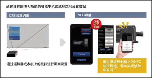 現已針對Android™和iOS進行了更新,搭載NFC功能實現即時配對,可以讀取并改寫投影機設置菜單,并可通過智能手機的相機進行自動聚焦。