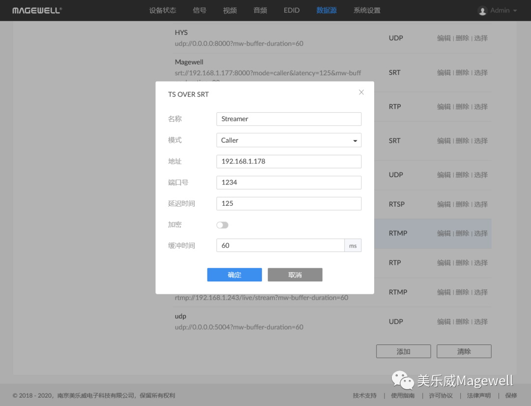 7. 設(shè)置完成后點(diǎn)擊確定,頁面會增加一個(gè)SRT Caller流的條目。