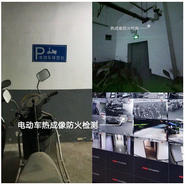 非機動車庫加裝高清攝像機及熱成像防火檢測攝像機,解決了非機動車庫安全隱患,同時提高了物業人員管理效率,原有的物業定時巡邏人員可通過監控室即可看到非機動車庫情況,并可智能進行溫度火點檢測。