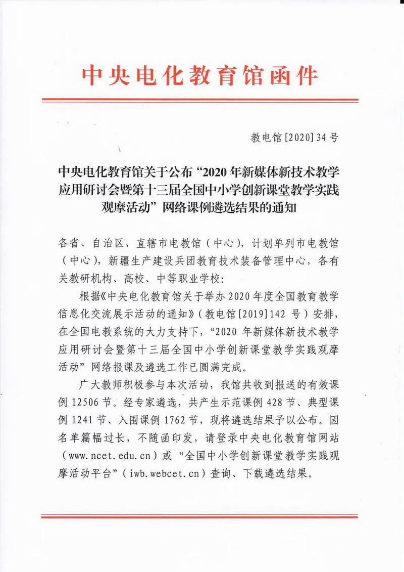 “2020年新媒體新技術教學應用研討會暨第十三屆全國中小學創新課堂教學實踐觀摩活動”公布評選結果