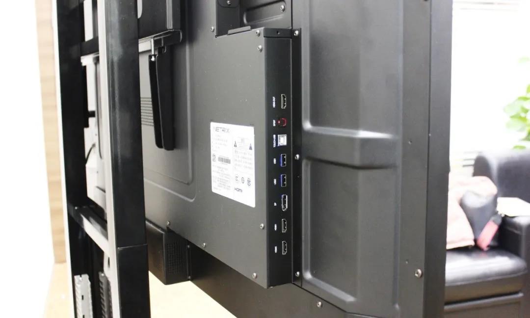 NETRIX智能交互平板NS751R,接口部分分別設計在了前部面板及背部側面,也是筆者關注過的類似產品中接口最全面、最豐富的一款智能交互平板產品。其中,前部面板接口為1個HDMI、1個 Touch-USB接口及2個PUBLIC-USB接口。
